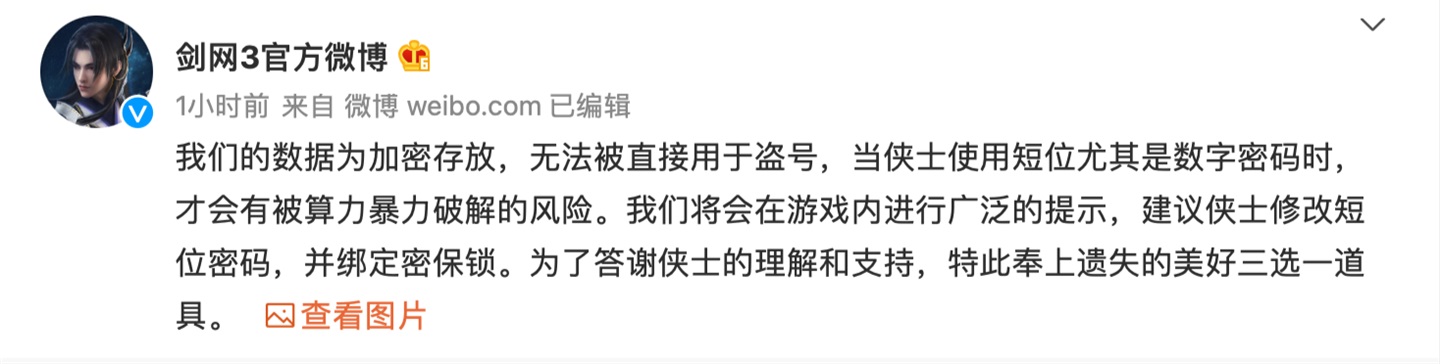 《剑网 3》将会在游戏内进行广泛的提示,建议玩家修改短位密码,并绑定密保锁。另外,官方还将送上遗失的美好三选一道具。