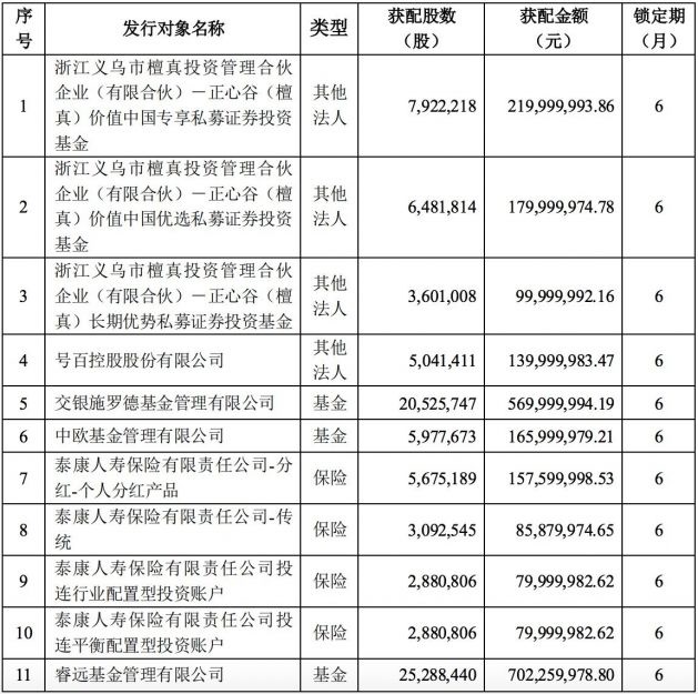 公告显示,三七互娱定增计划获多家机构的参与,最终确认获配对象为 14 个。其中,睿远基金认购金额最大,获配 7 亿元,中国电信旗下上市公司号百控股获配 1.4 亿元。