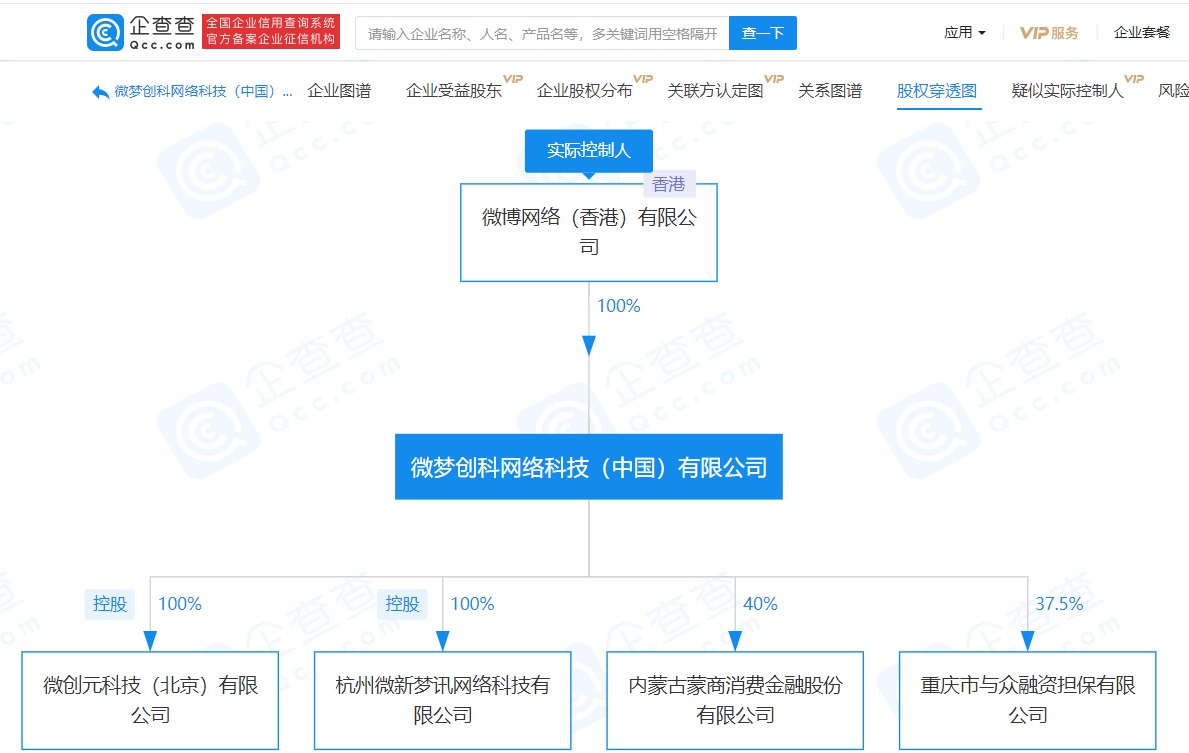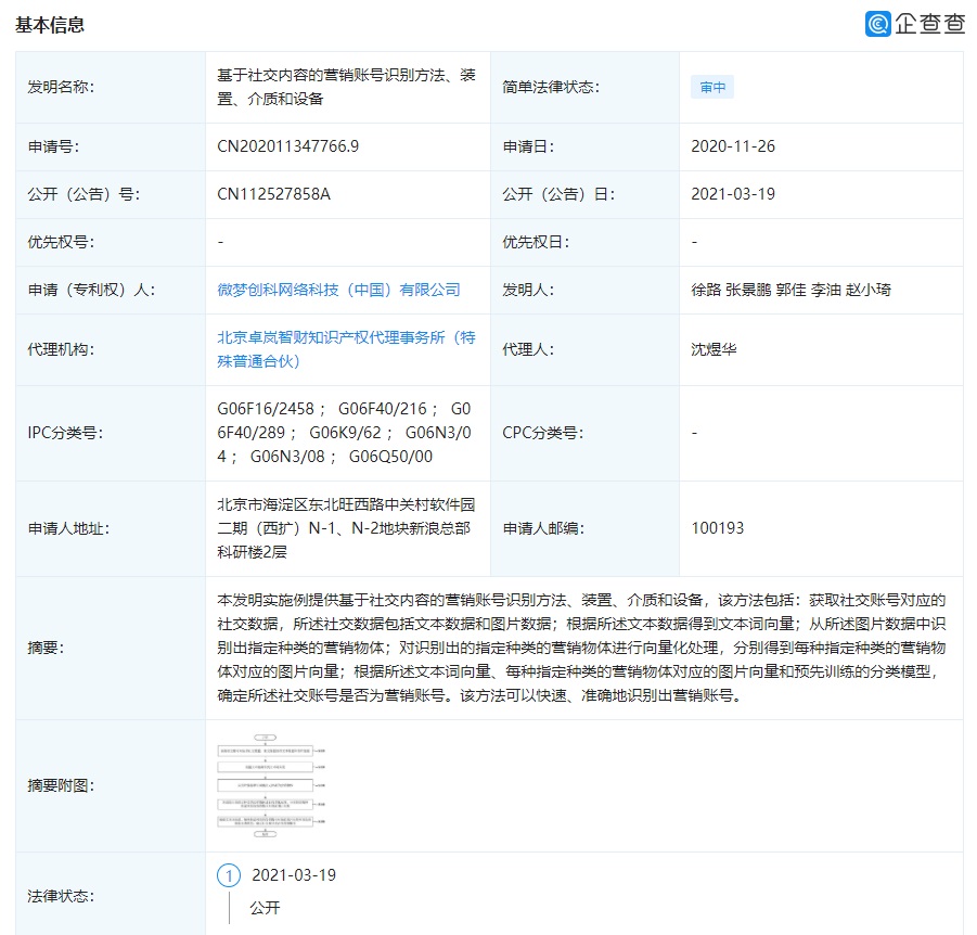 3月22日消息 企查查 App 显示,3 月 19 日,微梦创科网络科技(中国)有限公司公开多项 “刷量用户识别”相关专利,名称及公开号分别为 “一种刷转发量行为用户的实时识别方法及装置”,公开号 CN112528162A;“基于社交内容的营销账号识别方法、装置、介质和设备”,公开号 CN112527858A;“一种刷量用户识别方法及装置”,公开号 CN112529051A。企查查股权穿透显示,该公司由微博网络(香港)有限公司全资持股。